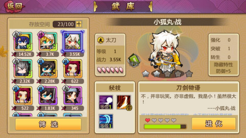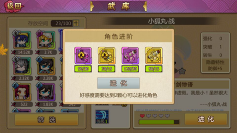 游戏首页中点击“进化”按钮即可进入页面。消耗材料即可进化刀剑小哥哥。值得注意的是,需要有足够的亲密度,小哥哥才会愿意换上新衣展示全新的造型哦!