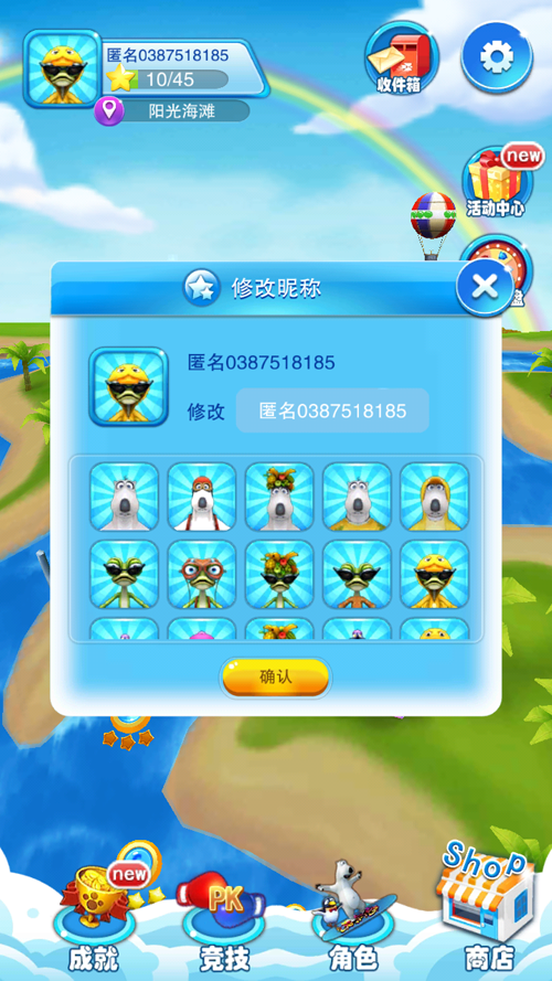 在游戏中。主界面左上角,同学们点击头像后,会发现可以自己设置自己的个性头像还有昵称哦,贝肯降落伞套装、草裙装、冲浪装、黄鸭装等都非常的可爱,另外不仅有贝肯,还有库拉卡、多多、公公,的各种套装头像任意选择哟。