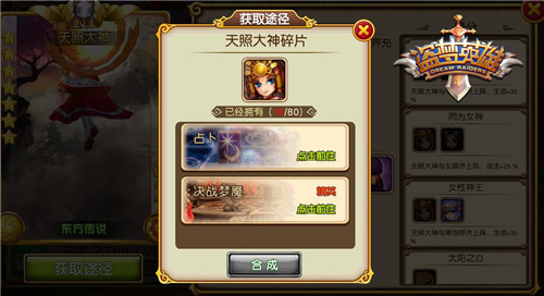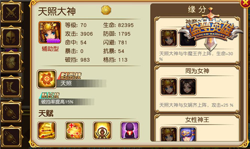 【缘分加成】 神魔共舞:与牛魔王一起上阵,增加生命30% 同为女神:与女娲一起上阵,增加25%攻击 女性神王:与卑弥呼一起上阵,增加生命30% 【阵容搭配】 在阵容搭配上,可以考虑天照大神、卑弥呼、孙悟空、猪八戒的混合阵容,天照和卑弥呼一起有30%的生命加成,大家可以想象一下两女神一个飘来飘出输出一个怎么都打不死的场景。孙悟空再补足输出,猪八戒在前面扛伤害,整体阵容还是挺不错的,有条件的玩家可以把孙悟空换成后羿,后羿在这个阵容中有32%的生命加成和36%的防御加成,本身伤害也不比孙悟空低。