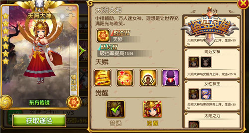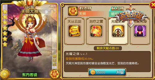 【天赋技能】 必杀技天照:范围内敌人致盲,并降低30%护甲,己方增加闪避,缓慢回血。 天丛云剑:对扇形区域敌人造成伤害,有概率使目标致盲2秒。 治疗之雾:友方群体回血 光耀之体:降低受到伤害 光之化身:增加自身生命并获得稳固