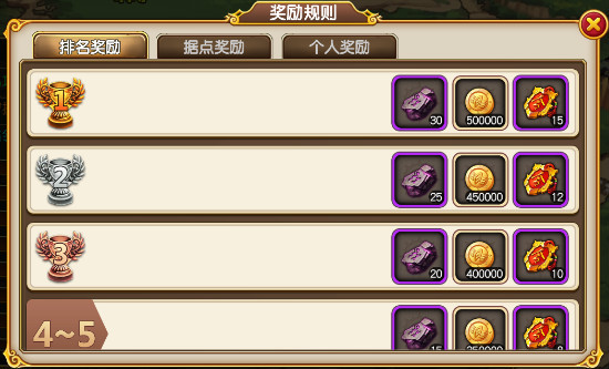 1.公会战奖励分为排名奖励,据点奖励,个人奖励。 2.排名奖励根据公会积分排名来决定。每周日晚上10点结算排名。 1)公会排名奖励非常丰厚,而且是每个公会玩家都能获得。所以一个强大的公会能让你每周获得很多额外的收益。 2)积分是由占领的据点进入布局阶段时候给予的,所以每天防守住高品质据点才能获得更多的积分。 3)橙色品质据点800积分,紫色据点350积分,蓝色据点160积分,绿色据点70积分。可以看出,一个高品质据点大于2个低品质据点。所以占领高品质据点才是王道。 3.据点奖励每天进入布局阶段时候发放。 1)橙色据点给予10个洗练石,能提高装备的属性,非常好的物品。紫色据点给予公会贡献,能在公会商店兑换英雄碎片,橙色套装碎片。蓝色据点给予经验粉尘。绿色据点给予金币。 2)高品质据点的奖励十分丰厚,所以尽量占领高品质的据点吧。 4.个人奖励根据个人活跃度来决定。每周日晚上10点阶段排名。 1)个人排名奖励的物品从某种意义上来说比公会排名奖励还好,所以尽量提高自己的活跃度吧。 2)个人排名是本服所有公会会员的活跃度排名,所以战斗力越高的玩家越有优势。尽量提升自己的战斗力吧。 3)活跃度的获得和在据点布置的防守队伍战斗力,布置据点的品质高低,进攻据点的品质高低,战胜的队伍数量有关。所以请根据自身的战斗力分配自己的进攻据点和防守据点,从而更好的提高自己的个人排名吧! ?公会战建议。 1.公会战地图很大,可以缩放查看所有据点的情况。 2.如果要掌控全局,可以点击公会战地图左边的箭头,会弹出据点信息界面。从这里你能很清楚的查看所有据点的情况和公会的战略意图,从而决定自己的行动。