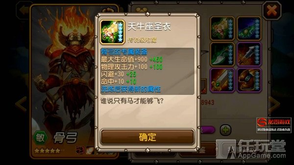 觉醒装备觉醒装备“天牛座圣衣”为骨弓增加最大生命值900,物理攻击力100,闪避+30,命中+10。天牛座圣衣可以提升骨弓的生存能力及输出能力,尤其是闪避+30的属性非常不错。