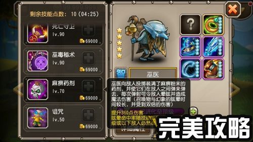 【技能介绍】 死亡守卫(大招):召唤一个致命的守卫来持续攻击敌人,造成魔法伤害。 巫毒秘术:巫医集中他的巫毒魔法来医疗周围的友方单位。 麻痹药剂:巫医向敌人投掷一些装满了麻痹粉末的药剂,并使它们在敌人之间弹来弹去,每次弹射令英雄晕眩较短的一段时间,并造成伤害(召唤物与幻象的眩晕时间较长,并受到双倍的伤害)。 诅咒:向一小片区域施放远古的巫毒咒术。被诅咒的英雄不但会持续流失生命,而且在诅咒时间内所受到的物理和魔法伤害都会有10%的额外加深效果,持续8秒。
