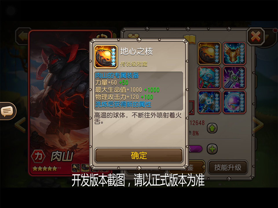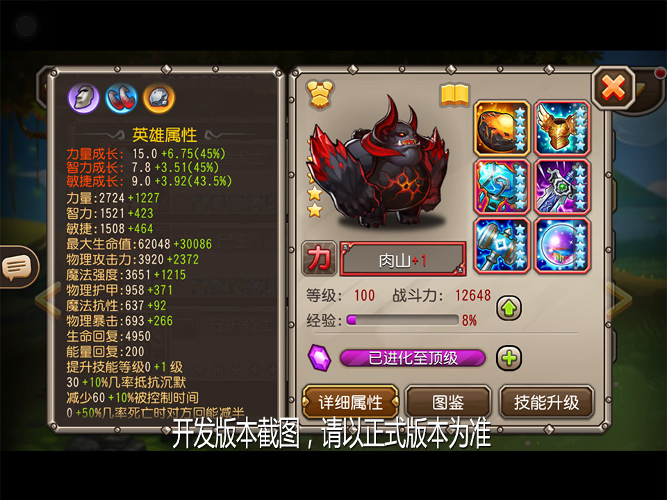 【属性介绍】 90级博学院,100级红1满装满附魔属性 ![]() 作为前排物理坦克类英雄,拥有超乎寻常的基础属性。三维过硬,其中力量属性更是碾压当前所有同类英雄,这让他拥有傲人的生命力和优秀的攻击力。同时出色的护甲、魔抗、生命回复属性更是为他的持久作战能力添砖加瓦。此外自身在减控上也是具备一定的优势。肉山具备多个范围伤害技能,并对敌人的行动产生限制,不朽守护技能更是向经典致敬,在开场时享有非常剽悍的属性加成效果。肉山大魔王终于暴怒入侵,相信战场上腥风血雨的搏斗即将拉开帷幕。 此外,肉山享受以下加成: 1.巨人——享受小小觉醒技能加成,可获得魔抗增强 2.恶魔之角——享受末日使者觉醒技能加成,可获得护甲增强 3.岩土系——享受大地之灵觉醒技能加成,可获得护甲提升 【技能介绍】 暴怒掀桌(大招):肉山陷入暴怒,将场景变换为火山地狱,在该场景下,肉山的所有技能都会获得加强,普攻攻击对每个目标都有溅射效果。肉山掀起面前的地板,对前方单位造成伤害并造成位移。 重锤(普通):肉山猛砸身边的地面,对周围敌人造成范围伤害,并将地面打出塌陷,敌人站在地面上超过一定时间,将会被地下喷出的岩浆击飞并造成伤害。在火山地狱下,岩浆伤害将更高,如果学习了“火药岩”技能,每次释放技能都会让背景火山喷发出一个火药岩。 火药岩(普通):肉山吐出体内高温的火药岩,火药岩被击破时会爆炸并会对周围敌人造成伤害,越早爆炸伤害越高。火药岩被肉山的技能或者其他火药岩的爆炸击中时会直接爆炸。在火山地狱下,爆炸范围更大伤害更高,且每次使用技能都会让背景火山也喷发出一个火药岩。 不朽守护(普通):肉山体内藏有不朽的守护,进入战斗时提升肉山一定百分比的攻击力,护甲及魔法抗性,并免疫大部分控制。但是,当肉山损失一定生命值时,将会失去免控效果,被敌人击杀时,对方将会获得不朽的守护,当对方死亡时,将会抵挡那次伤害并回复一定的生命值。 暴怒掀桌: ![]() ![]() 肉山陷入暴怒,将场景变换为火山地狱。 在该场景下,肉山的所有技能都会获得加强,普攻攻击对每个目标都有溅射效果。 肉山掀起面前的地板,对前方单位造成伤害并造成位移。 重锤: ![]() ![]() 肉山猛砸身边的地面,对周围敌人造成范围伤害,并将地面打出塌陷。 敌人站在地面上超过一定时间,将会被地下喷出的岩浆击飞并造成伤害。 在火山地狱下,岩浆伤害将更高。 如果学习了“火药岩”技能,每次释放技能都会让背景火山喷发出一个火药岩。 火药岩: ![]() 火药岩被肉山的技能或者其他火药岩的爆炸击中时会直接爆炸。 在火山地狱下,爆炸范围更大伤害更高,且每次使用技能都会让背景火山也喷发出一个火药岩。 不朽守护: ![]() 肉山体内藏有不朽的守护,进入战斗时提升肉山一定百分比的攻击力,护甲及魔法抗性,并免疫大部分控制。 当肉山损失一定生命值时,将会失去免控效果。 被敌人击杀时,对方将会获得不朽的守护,当对方死亡时,将会抵挡那次伤害并回复一定的生命值。 【站位介绍】 ![]() 作为前排坦克类英雄,肉山站位位于前排靠前位置。自身的生命和防御属性非常出色,这让他更持久地伫立在前排为身后的队友创造舒适的输出空间。与此同时,他擅于创造火山地狱环境,利用熔岩和岩浆折磨对手,影响敌方的行动。不朽之守护更增加了对战的乐趣,到底是让己方的阵营势如破竹,还是成全对手强力的反扑,这就要看队长大大们如何搭配阵容喽! ★★出世即觉醒★★ 肉山在岩浆中汲取到无尽的能量从而获得觉醒能力! 队长大大们只要将他培养到90级橙,即可开启他的觉醒之旅咯~~ ![]() 觉醒技能: 熔岩核心:肉山体内的高温核心即将破肚而出,所有从正面攻击肉山的敌人将会受到燃烧伤害,当肉山正面受到燃烧伤害,当肉山正面受到超过一定值的伤害时,肚子将会被破坏,此时燃烧伤害将会更高。 ![]() 觉醒装备: ![]() 专属装备合成材料: ![]() 觉醒之旅: ![]() 觉醒之旅第一站:队长大大们可以在第18章精英副本-陨石之雨中收集肉山的觉醒材料; 觉醒之旅第二站:肉山参与完成任意预言之池难度5或以上,2次; 觉醒之旅第三站:肉山独自参与完成普通关卡:第13章-泰坦遗迹,1次。 【小剧透】 1.属性超凡——在红1阶中身披5件红色装备,自身拥有非常卓越的力量成长,生命值、护甲、魔抗等属性非常出众,这让他更持久地在战场上充当好坦克的角色。正如英雄介绍中所写,“肉山大魔王是拥有超过一般英雄基础数值的强力英雄”。 2.场面震撼——开场时肉山大魔王从火山中霸气爬出,庞大的体型,凶猛的造型无不让对手心肝一颤。暴怒的肉山,直接引发场景的变换,火山地狱场景气势磅礴,掀翻地面的动作摧枯拉朽,这等让人热血沸腾的场面等待队长大大们亲自去见证。 3.重拳与熔岩——肉山的每一击重拳都能造成地动山摇的效果,被狠砸一圈的敌人会感到非常头痛。另外他还会利用火山喷发出的岩浆和熔岩,对敌方造成大量的群体伤害,并附加一定的控制效果。队长大大们可千万不要小看肉山的输出能力哦! 4.利己利敌?——不朽之守护技能让肉山开场时拥有惊人的战斗力,阵容搭配合理时将发挥其最大功效,但是如果被击杀,对方也将会获得复活盾,必将发起更有威胁的反击。不知队长大大们在看到这一有趣设定时,是否唤起一些陈年的记忆呢