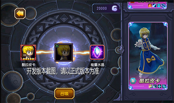 ★★新英雄-酷拉皮卡介绍★★ 【召唤介绍】 与其他英雄不同,酷拉皮卡属于《猎人×猎人》联动角色:当玩家首次获取时,得到黄5星英雄酷拉皮卡,还有一块能量水晶。