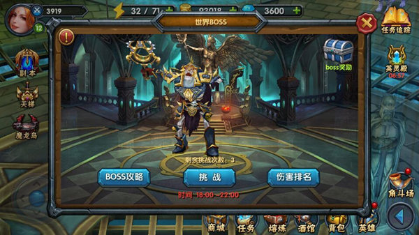 ★强大BOSS之战 Boss之战是玩家在游戏中最值得期待的,前期的升级装备,提升自身实力,都是为了和最终的BOSS一决胜负, 《刀塔世纪》世界BOSS不止一名,每个BOSS的弱点都不一样,需要自由搭配才能战出最高伤害值,大大增加了玩家的乐趣,战斗也会变得激情不断。