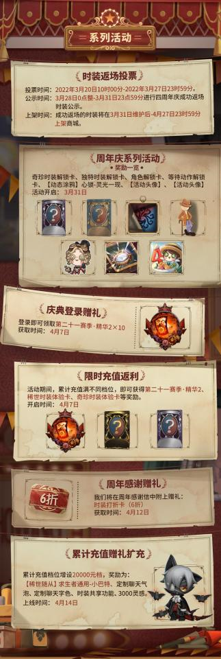 四年的时光,因你们的陪伴而显得格外珍贵。周年庆期间,《第五人格》将开启一系列的精彩活动:登录签到最多可得10个周年庆宝箱精华,参与各类活动有机会获得奇珍时装解锁卡、角色解锁卡、动态涂鸦、活动头像等珍贵好礼,一封内含6折时装打折卡的感谢信也将向你倾诉这四年来的美好点滴与深切感恩。