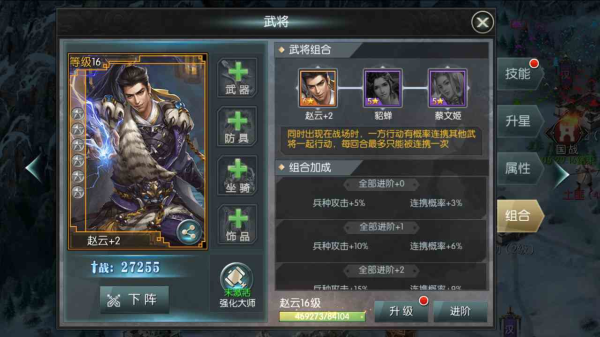 武将按照稀有度分为一星到五星,稀有度越高一般代表着实力越强,但具体的使用效果还得看武将与武将之间技能的搭配和兵种的相克。单单获取有潜力的武将是不足以应付战争需要的,一个名将从获得到形成足够的战斗力,还需要玩家的不断培养,最直接的方式莫过于提升等级、升星、打造武将装备了。