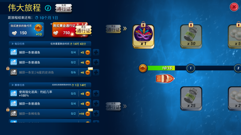 除此之外,首次推出的“通行证”玩法也别有新意,随着垂钓生涯的不断前行,通行证将伴随着我们共同成长,在每个精彩而难忘的成就达成时获得更多奖励!积分获取的方式非常巧妙,只需完成每日更新的挑战任务,就能够获得通行证积分;如果积分溢出,还能兑换游戏内的各种垂钓物资,更有通行证限定皮肤奖励等待解锁!助力垂钓旅程、获得更多乐趣!
