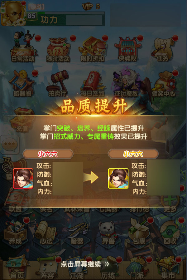 掌门的品级升为金色后,随之到来的,便将是整个江湖格局的改变。升金后的掌门,不单功力提到了明显的提升,在属性、招式、专属资质等方面,也将会明显强于之前的红色品级。俗话说得好,能力越大,责任越大,随之而来的,抑或是更加惊险和危机重重的挑战。 霸气掌门全面升级,重掀江湖波澜,搅动武林风云。全新时代即将来临,唯有潜心修炼,努力提升,更上一层楼,方能迎接下一波武林浩劫,重振掌门之威。 |