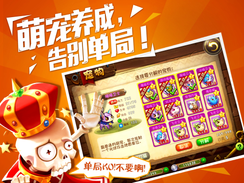 【单局KO不要啊:萌宠养成,告别单局!】 《恶魔不要啊》融入宠物养成系统,通过培养,宠物可提升品质、等级和星级,随着星级和等级的提高,宠物战斗力会得到相应提升。随着宠物的星级、等级提升,宠物的外形也会相应产生变化,让玩家拥有更多养成乐趣。