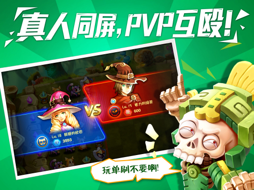 【玩单刷不要啊:真人同屏,PVP互殴!】 《恶魔不要啊》全球首创真人同屏对战PVP玩法,尽享与人斗的策略竞技乐趣,改革传统塔防游戏缺乏玩家之间协作和竞争的社交机制,让玩家彻底告别单机时代。在PVP玩法中,玩家可分别扮演进攻与防守阵营,两种身份都要求玩家具备较好的博弈与宏观指挥能力。进攻阵营更贴近RTS玩法,偏重战时微操,讲究布阵策略,一步简单的操作都可能影响整个战局。
