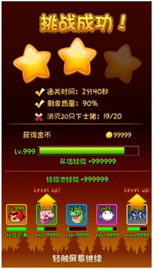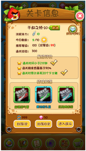 通关条件 1、击杀本关BOSS成功后,则通关成功;挑战关卡过程中小鸟死亡,通关失败。 星级评价 1、系统需根据玩家在本次关卡中战斗的表现进行星级评价,满星为3星,可根据不同关卡的特点进行星级评价。 玩家在一个大关中累计不同数量的星星数,可获得不同档次的奖励,分别是获得7、15、30颗星星的时候可获得奖励。