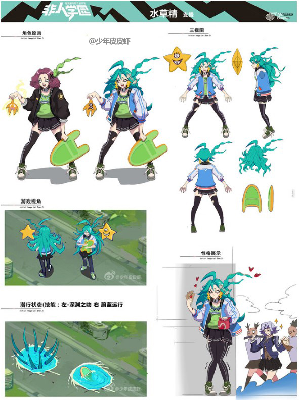 除了狂野脑洞和魔性画风的奇葩角色,设定完整、画面风格亮眼的“野生系列”们更是让人怀疑是设定流出。不单有高度契合画风的原画、三视图、表情、游戏视角,各种设定更是手到擒来。比如水草精,就拥有被动、主动技能在内的完整技能设定,且角色背景也十分个性——是白骨精大姐头的小透明迷妹喔。