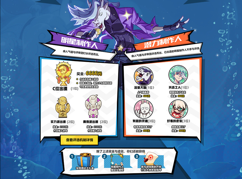 全民争做制作人,让你的脑洞C位出道!《非人学园》夏日祭欢乐进行中,以龙宫角色为主题的首届脑洞创意大赛,也已在7月19日圆满截稿。7月24日12:00至27日16:00,大赛投票阶段正式开启啦!快来看看小伙伴们都给出了什么样的骨骼清奇的作品,为“龙宫101”的小哥哥小姐姐们投票,优秀作品将会真正被做进游戏中,赶快送TA出道吧! 快来参与投票 送脑洞们C位出道 本次脑洞创意大赛经过投票和评审后,综合得分最高的角色设计,将摘得“C位出道奖”,赢取6666元奖金,且该角色将被真正做入《非人学园》!此外,还有“实力派出道奖”、“偶像派出道奖”等奖项,得以展现他们的不同风采,下面就一起来见证众多优秀作品,记得为你心目中的大神投票,与TA在学园相见!