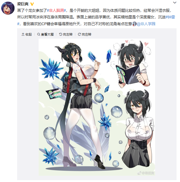 陨石脑洞超乎你想象 公测以来,《非人学园》人设创意满点的学园明星们闪亮登场,同学们的无限灵感也纷纷激发,脑洞停不下来!在首批参赛作品中,单是龙女一个角色,就涌现出大量脑补无边际、思维无限制的“奇葩”作品。比如获得了不少人气的这版龙女,因怕热体质导致经常汗湿,竟然随身携带冰块降温,表面上是品学兼优的开朗大姐姐,然而暗地里却沉迷钟雷CP无法自拔……