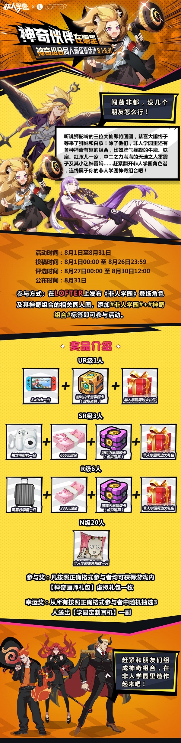 喜迎狮驼岭三人组一家团聚,《非人学园》携手LOFTER的“神奇组合”同人画征集活动开始了!只要连线非人学园角色,创造属于你的神奇组合,就有机会赢取现金红包、拍立得相机、网易行李箱、学园饭卡和精美周边,更有荣誉学员卡、Switch豪华大奖等你来拿!
