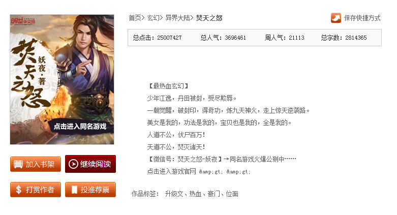 《焚天之怒》定制IP小说由玄幻大神妖夜创作,于创世中文网首发后,即刻霸占各大玄幻文学榜单,引发业界与读者热议。而其同名IP《焚天之怒》手机版即将上线,将以全新形式,重现妖夜笔下宏大的玄幻世界! 图1 《焚天之怒》定制IP小说