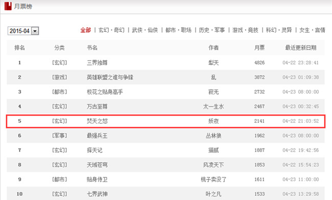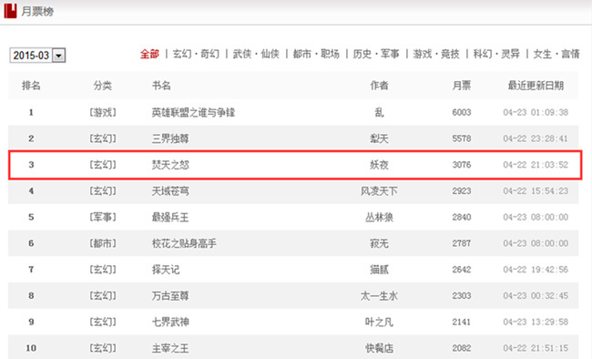 图3 创世中文网2015年3月月票榜