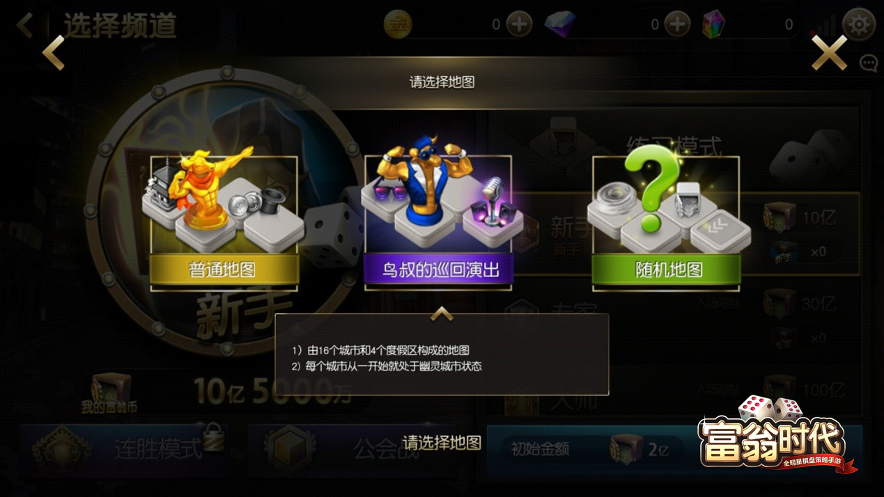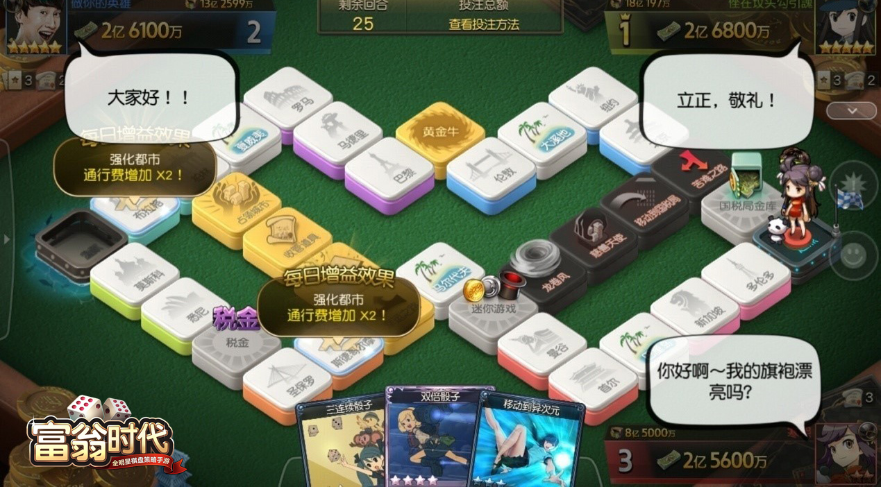 更依靠策略,更快节奏的新大富翁类游戏玩法 《富翁时代》以大富翁类玩法为基础,通过投骰子来决定角色的移动格数,期间占领并升级土地让对手缴交过路费,最终让所有对手破产获得胜利。但在这个基础上,搭配上角色属性、骰子特性以及技能卡片的系统,让大富翁类戏不只是靠运气,更增添了战略要素。 ![]()