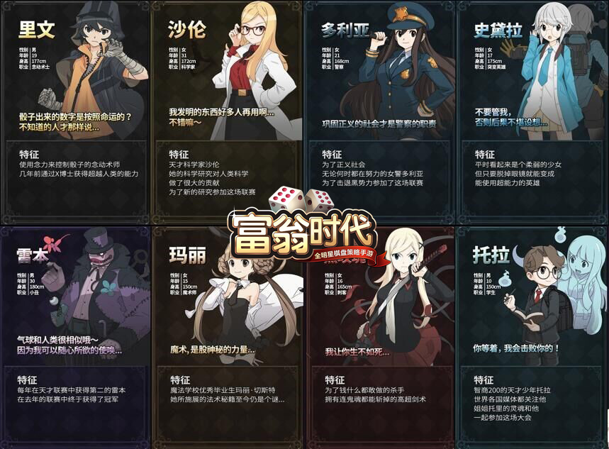 日漫风格的二次元魅力角色,同名漫画即将开启连载 游戏整体画面风格采用了日漫画风。不同设定,性格迥异二次元魅力角色是让《富翁时代》更具乐趣的要素。故事围绕着邪恶博士一手打造“天才联赛”为故事大背景展开,在这个主线剧情之下,里文(念动术士)、托拉(天才)、黑玫瑰(杀手)、多利亚(警察)、林威(武术家)、玛丽(魔术师)等十余个角色命运被紧紧联系在了一起。