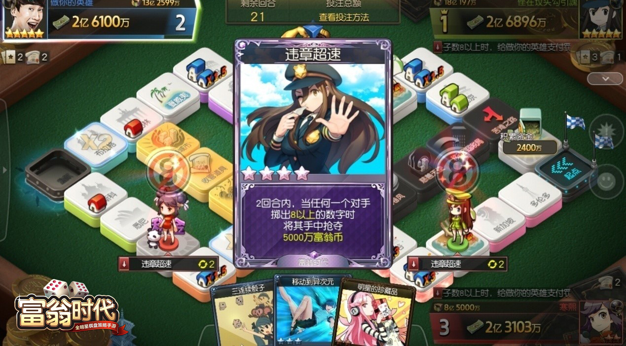 游戏开创性的推出了技能卡系统和通行费付费规则等独特要素,大大提升了游戏的整体战略性并且与同类游戏作出了区隔。在玩家靠骰子给的运气前提下,接入“技能卡”系统,给玩家提供扭转局势的机会,体验意想不到的乐趣。游戏目前有50余张技能卡,收集技能卡图鉴,让玩家成就满满。游戏节奏和传统大富翁类游戏相比更加紧凑,充分利用碎片化时间,5分钟完成刺激对决,1秒就有可能决定谁是上亿富翁! ![]() (图8:以亿为单位的激爽胜负)