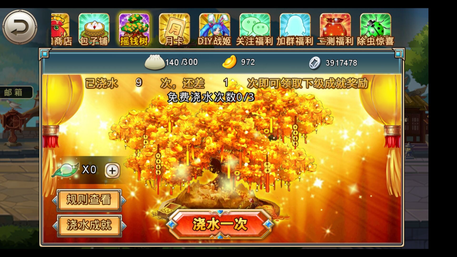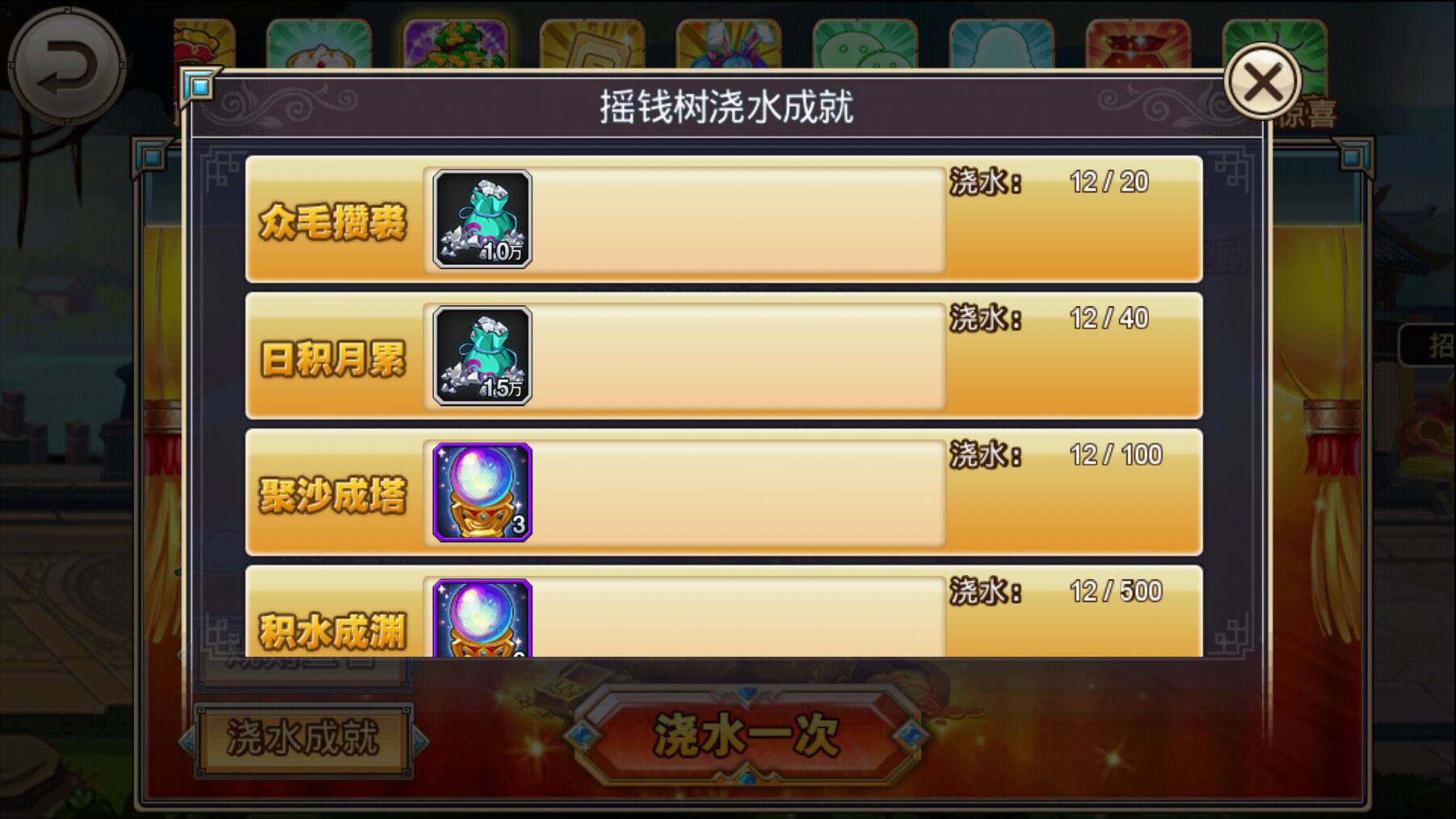 主公每天的浇水都可以进行累积,可以在“浇水成就”中领取相应的奖励。(都是大把大把的银币!) 1.玩家每日(时间以服务器时间为准)可对摇钱树进行浇水,获得一定数量的银两,每次浇水需要消耗1个甘霖玉露。 2.银两的获取数量为:初始获取两+基量*玩家等级且在浇水时有几率出现暴击(2、3、5、10倍暴击) 3.每个玩家每日(每日6:00发放,在该界面直接显示)均有3次免费浇水的机会(3个甘霖玉露),玩家可以花费20元宝购买1次浇水次数,购买次数无限。 4.玩家在浇水过程中,根据浇水次数,可以完成成就活动(成就每7日重置)。 5.该活动长期有效。 |