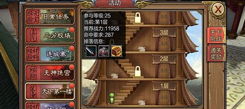 那对于天下第一楼有什么技巧可以快速通关呢? 天下第一楼攀爬技巧 玩法须知: 打开活动,点击天下第一楼,系统会提示你参与等级必须在25级以上,推荐战力和命中要求以及掉落物品的信息,先告知玩家们一件事,挑战的时候建议换一把好一点的武器,比如一元硬币兑换的橙色武器,不但可以加成VIP属性,还能提高你的战力。