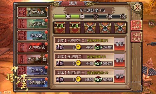 无论是副本、野外、城池,还是溪流、瀑布、落叶,UI都有所体现出细分。特别是人物的特技,在施展之后还呈现技能名。厮杀的力度更加的明显。 战斗结束后的帧数停顿,瞬闪慢镜幻影的美术水准,增加了战斗的体验,吸引玩家的眼球,成为玩家舍不得离弃的一部分。 核心玩点,突破不寻常的路线 滚轮式海量经验副本 单一的游戏副本挑战不再是玩家的追求,《风云》的副本结合影视剧的需求,设定了故事情节,天下第一楼、无神绝宫、剑宗轮回、连城寨、侠王府,每种副本分别有3种挑战难度,玩家可以选择单刷或是组队挑战。完成的副本任务还能送上等级经验,对于成长过程中都是非常有利的。