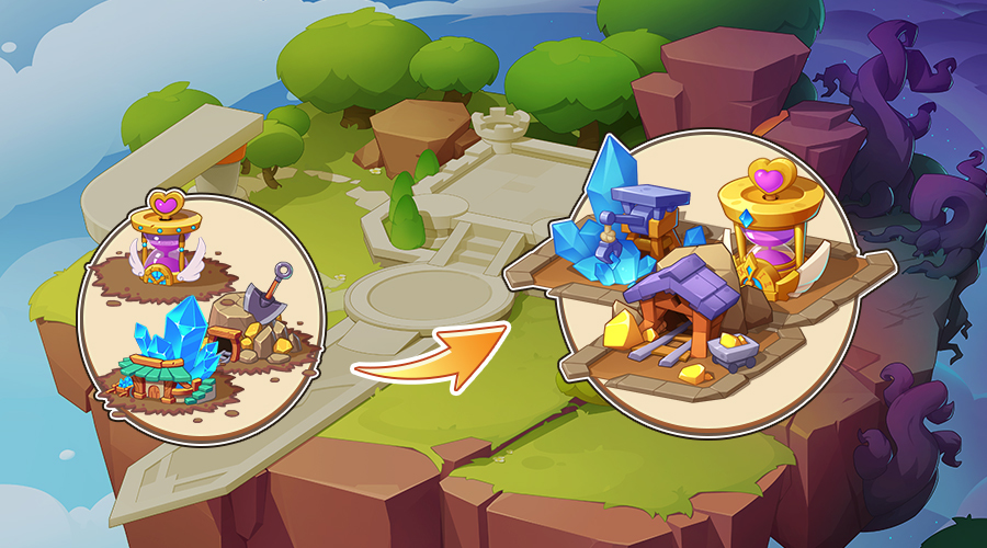 悬空岛保留了守望塔和矿物的原有等级,但拆除了圣物(资源按1:1全部返还),空出来的位置可以用来建设新建筑——雕像。