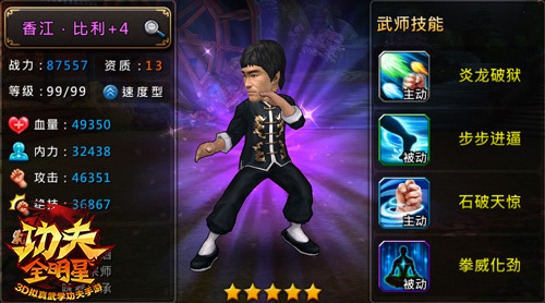 香江·比利是速度型武师中爆发最强的一个,而且拥有被动技能增加自身的移速,战斗起来相当的灵活。大招【炎龙破狱】对敌人施展火焰五连拳,造成成吨的伤害,同时身上着火,持续10秒。在没有属性克制的情况下,此招一出,对面一定是重度伤残!史诗技能【拳威化劲】,在施放【石破天惊】时,可额外恢复内力137点。一般在使用香江比利战斗时,要利用移动速度的优势,避免跟对方正面交锋,内力槽全部攒满之后,大招连放,直接秒杀对手。 佛山传奇,速度才是王道!