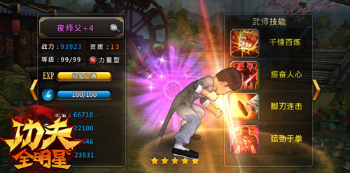 夜师父:精通咏春拳,秉持练拳连心的态度精进自身武艺,于佛山拳术界负有盛名。一代咏春功夫宗师,是普通攻击能力较强的力量型武师,对防御型武师可以造成毁灭性的伤害!其必杀技千锤百炼主要对敌方个人造成较大的伤害,会将敌人按倒在地并以连拳的方式攻击对手,招式的最后还会接一个连击后辅以回旋踢。