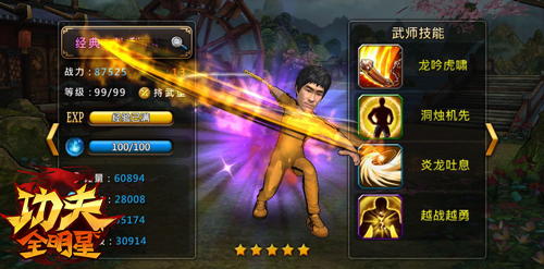 经典·比利:该武师的人物原型是电影《死亡游戏》中比利,是家喻户晓的截拳道的创始人,战斗力非同一般。看过《死亡游戏》的人都会对比利在首层与菲律宾高手的双截棍比试印象深刻,那是全剧的精华。同样游戏中比利的双截棍也是其必杀技。该技能会造成巨量的群体伤害,在割草式战斗中有相当不错的表现。技能被释放的同时,比利的双截棍及周身会附上火焰效果,在三秒内对敌人连续攻击数十下直至将敌人击出攻击范围。