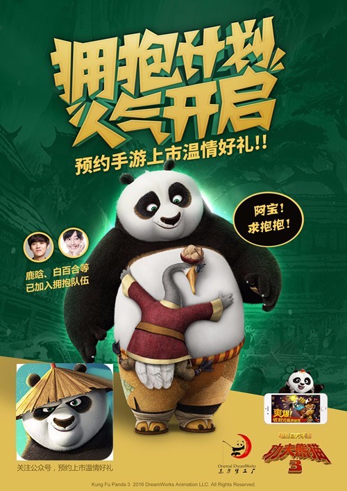 “拥抱计划”的意义不仅仅在于征集温暖,助力阿宝父子团聚,更重要的是通过“拥抱计划”形成“温暖效应”,感染更多的人加入拥抱大军的行列,将这种爱与温暖的力量传递出去。而《功夫熊猫3》手游在春节档所传递的温暖力量,不仅仅是一种相拥的温度,更是给大家带来这个春节最欢乐逗趣、最轻松畅快、最具认同感、最具代入感的游戏体验,这种游戏体验所产生的力量,是可以团聚你的好友,你的家人,甚至结交新朋友的一种温暖载体。2016春节档,让我们因为《功夫熊猫3》手游而团聚,而将欢乐和温暖输送给更多的玩家们! 【关于《功夫熊猫3》电影官方手游】 噔!噔!噔!神龙大侠,终极回归!2016春节档大片《功夫熊猫3》官方授权动作手游摒弃了传统虚拟摇杆,采用点触操作方式!网易重金研发,联合东方梦工厂重磅推出!戏未上映,手游先“玩”为快!肉身滚碾怪物,太极吸卷众怪,飞檐狂砸Boss……一场炫目震撼的技能视觉盛宴!阿宝、师傅、悍娇虎三角色切换上阵,出战策略趣味十足!各式创新闯关玩法轮番来袭,PVE打怪,闪避滚石……CG动画剧情,经典电影桥段游戏中重现!30多个电影原著角色伙伴悉数登场,助你一路征战!3.5头身Q萌人物设计,给功夫熊猫迷耳目一新的视觉体验! 白百何领衔明星助阵功夫熊猫拥抱计划视频