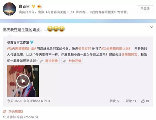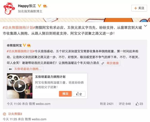 【《功夫熊猫3》全明星“熊抱”接力 用爱传递感动温暖寒冬】 《功夫熊猫3》史上最豪华全明星配音阵容也加入到“拥抱计划”的温暖行动之中。中方导演滕华涛、乌龟大师配音演员张纪中、娇虎配音演员白百何及灵蛇配音演员朱珠化身“拥抱大使”,开启全明星“熊抱”接力,以温暖拥抱隔空再现影片中阿宝的师徒之情与“盖世五侠”的兄弟之爱。在线下活动温暖开启的同时,《功夫熊猫3》的线上“拥抱计划”也在新浪微博及移动端火热进行中。短短一周内,#功夫熊猫拥抱计划#的活动话题已经突破700万阅读量,并且有近三万名网友参与了“拥抱计划”的线上互动,助力阿宝奔向爸爸的怀抱。