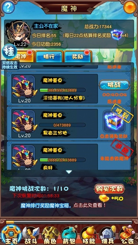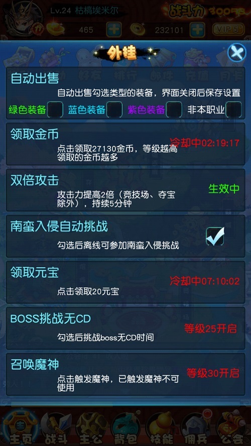 2. 挂机与外挂:别出心裁的尝试 很多手游对玩家的的时间需求量极大。为了增长经验或收集物品,它们要求玩家重复一些无意义的游戏行为。这些游戏对比较匆忙的玩家并不友善。于是,一些挂机外挂应运而生。 也有个别游戏尝试允许挂机,然而,要做到允许所有人挂机,而同时又保持游戏的趣味性——这并不是一个容易解决的问题。 《挂机吧兄弟》既然连名字都在呼吁挂机,证明它在这方面是有一定自信的。在该作里,玩家可以自动挂机的项目是:单人副本、世界BOSS(即南蛮入侵);玩家还可以快速战斗或者跳过战斗。另外,游戏自给的外挂还包括一些buff和额外收益。 这些外挂为玩家节省了很多时间,然而说得动听,事实上它并没有为玩家提供太多时间之外的便利。这极大地保持了游戏的平衡性和趣味性。
