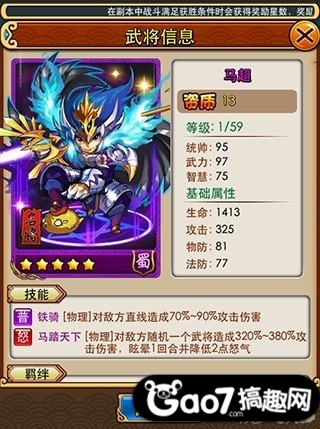 有人很奇怪为什么我会选这个一个12资质的武将作为推荐输出呢?因为太史慈作为后排输出,在进阶到7以后对后排的威胁会达到一个相当恐怖的地步。怒气攻击60%附加一次额外伤害,普通攻80%附带一次额外50%伤害,太史慈的这个附加,在打死对面一个武将之后,还会自动转向另外一个攻击目标,很智能。缘分方面,马超的攻击加成,姜维的生命(这里知道为什么我说姜维是百搭了吧),周瑜等人的缘暂时不介绍,因为暂时没开放,紫马和蓝书的加成,依然难成型。