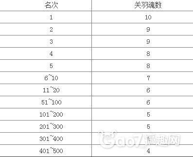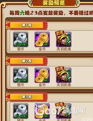 比武场每周六晚上11点都会发放次奖励,其中排名前500名的玩家都可以获得关羽的武魂,只是获得的武魂数量不同。