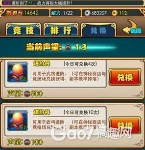 竞技场的战斗可以获得声望,累积一定的声望可以兑换进阶丹。一般情况下是100声望10个进阶丹,500声望50个进阶丹,1000声望100个进阶丹。要强调一个竞技场进阶丹兑换可是每天有次数限制的哦。