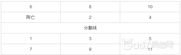 可以看出减员之后就攻击的先后顺序就会发生变化,2号位的阵亡让敌方取得了先手,这样会让玩家处于被动,控制技能无法第一时间发挥效果。所以要避免这种情况的发生,那么1号位与7号位的攻击就不能太高,以免2号位第一时间阵亡,争取让其他武将将其余位置的武将击杀;抑或是7号位是张郃这种菊花杀手型武将兼带后排控制技能。