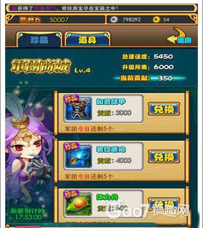 军团商城会随机刷出装备,这里只能使用军团贡献进行兑换,贡献可以通过“军团大厅”的建设获得。
