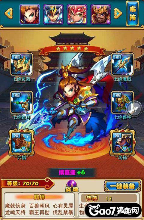 战魂紫的真是太难出了,出几个加攻击生命的蓝的戴上也不错,差距也不是太大。这里别搞错了,武将技能有写物理还是法术攻击,别搭错。