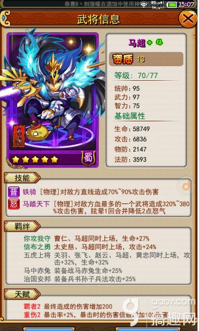 即使天赋进阶不能满级,依然保证了他的上场率,一般如果走蜀国路线的玩家都会上场,很少看到放在小伙伴的。普通技能虽然是直线,但是小编想说的是单体攻击在游戏中是最高的,没有之一。320%-380%的伤害而且还附有眩晕降两点怒气的效果,简直变态到极致。和曹仁的生命羁绊,让他们一肉一攻,无疑在开场就占据优势,和太史慈的攻击羁绊,还有最好五虎上将攻击和生命羁绊无人能敌,赤兔有25%的生命羁绊,孙子兵法有25%的攻击羁绊。不管你怎么去搭配他,马超都不会让你们失望,值得培养进阶。