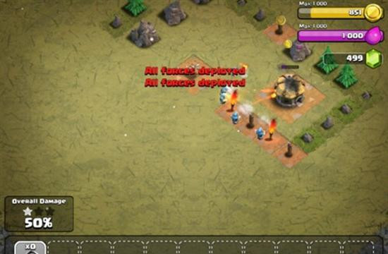 之后系统会给我们几个法师,让我们攻击哥布林的村子,点地图不红的地方就会出现,点击一下出现一个法师,瞬间点击五下,把所有都召唤出来,打爆所有建筑就ok。