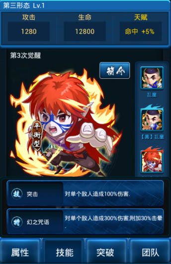 本着前期BOSS水平较低实力较次的原则,乱童也不过是三星的蓝卡。天赋是可怜的5%命中,从项目到数值都可以说是聊以自慰的程度。不过怒气技能倒可以说是有那么一些亮点,30%的击晕已经不算很低了。在战斗中多多少少还是有点帮助的。
