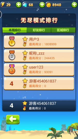 PK挑战和无尽模式都各有3个排行榜(每周一零点清零) 1、本周排行:所有玩家每周的排行,能进这个榜的都是大神啊 2、好友排行:连连看好友间的排行啦 3、区域排行:以省为单位排名,快去看看周围的小伙伴哪..