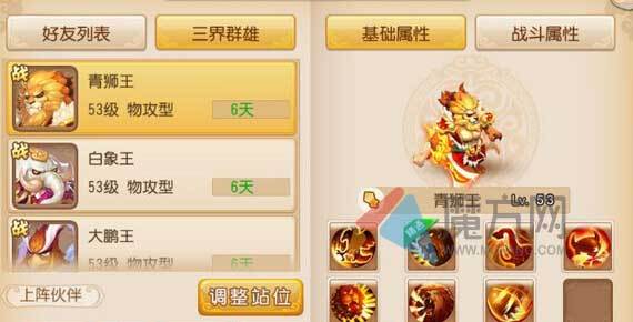 被动技能:狮吼(狮搏额外忽视目标20%防御)、狮驼庇佑(三兄弟一起上阵有释放技能时,为其他两者增加一定物理伤害,伤害效果累加,直到死亡清零);