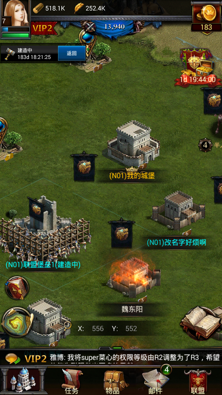 3、前期最重要的是追城堡等级,当城堡升级之后,该升级什么?除了升下一级城堡必备的建筑外(如城墙),主要升级大使馆,校场,兵营。