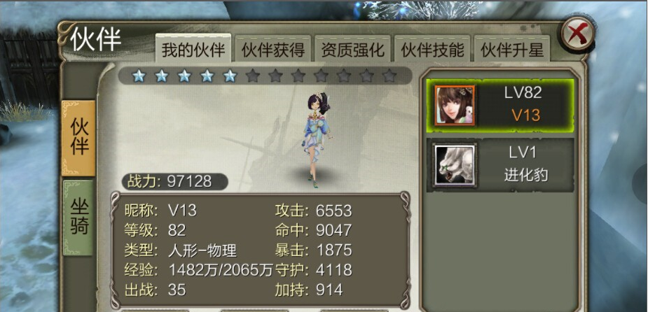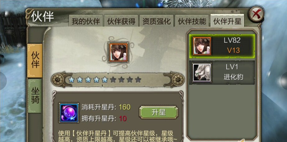 使用【伙伴升星丹】可提高伙伴星级,星级越高,资质上限越高,星级还可以被继承。升星丹可以商城购买10元宝一个,或者可以从副本翻牌获取。记得哈,伙伴星级一定要进化到至少4星,然后优先把攻击力这块加满,你的战斗力就上去了。