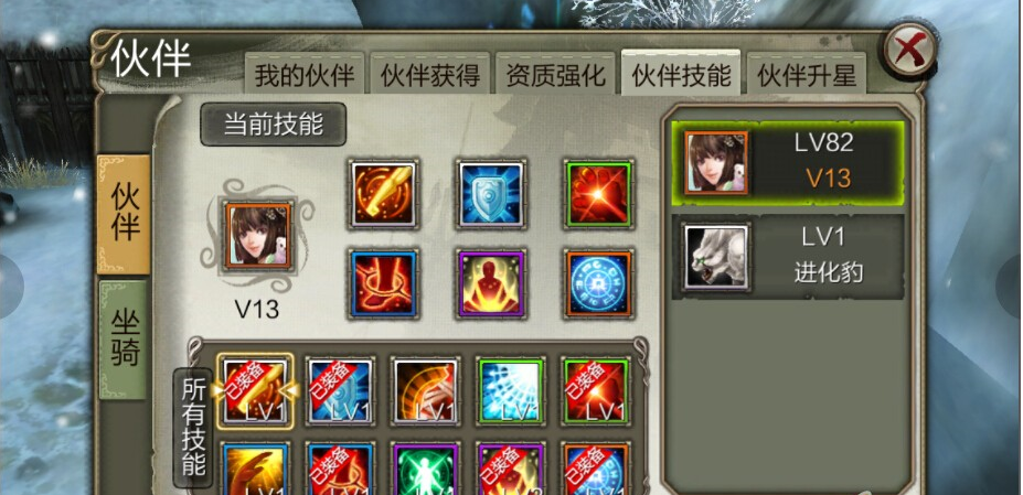 伙伴资质高要配合上伙伴技能才能让伙伴变得强力,技能目前可装备的有白绿蓝紫橙不同颜色的技能。伙伴技能可以在技能包里面随机开出来,副本结束后翻牌有几率出现,同样有几率出空气世界BOSS天上童老有几率掉落紫色技能书一级橙色技能书。少室山最后一个BOSS有几率掉了紫色伙伴技能书。